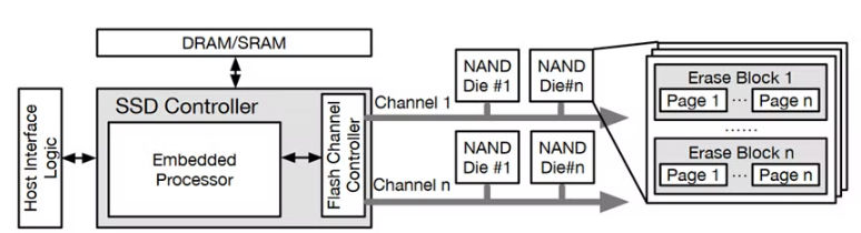 SSD的闪存芯片支持读取、写入和擦除3种操作。读写操作的粒度是页,而擦除操作的粒度是块。闪存具有不允许就地更新和芯片寿命有限的特性,即每个块在更新其中页时必须先全部擦除、每个闪存单元具有有限的读写循环(Program/Erase, P/E)次数。