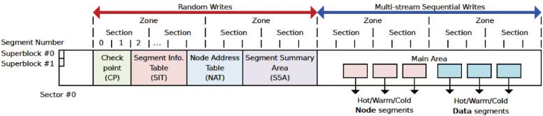 F2FS在盘上组织为两个区域:随机写区域和顺序写区域。